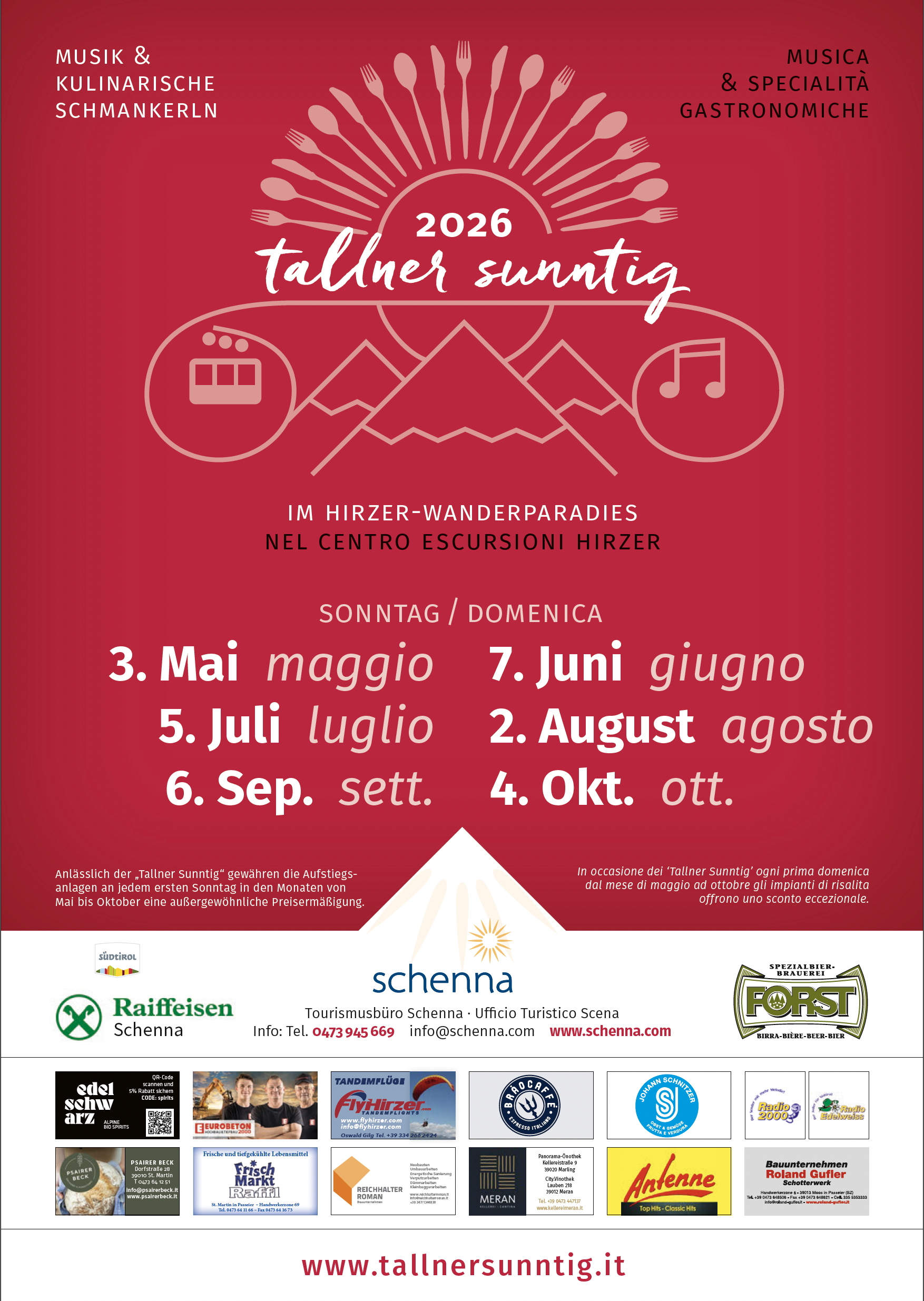 Tallner Sunntig is promoted by “Verdinser Seilbahn”, “Sesselbahn Grube” and the inns and lodges of Obertall, Videgg and the Hirzer area.